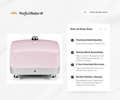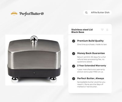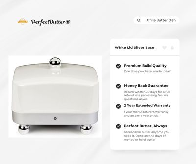 Our Guarantee We stand by the quality and patented technology of the Alfille Electric Butter Dish. If your order arrives damaged or if you encounter a technical fault, we are here to help. We provide a straightforward returns process and dedicated local support to ensure any issues are resolved as quickly as possible, getting you back to the perfect spreading experience you expect from PerfectButter®.